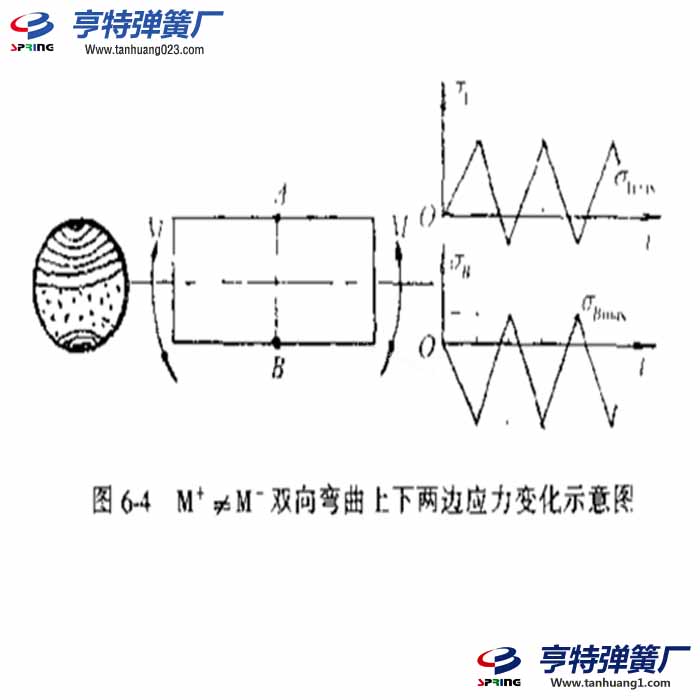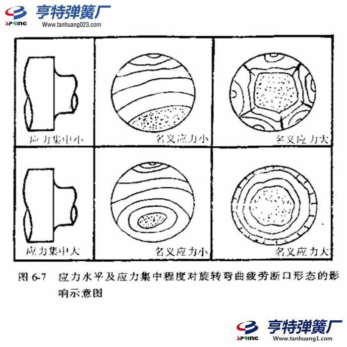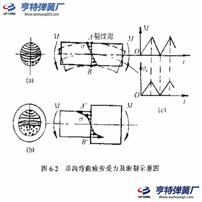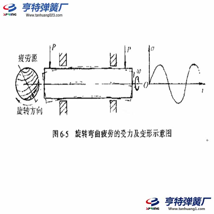 因在疲劳载荷作用下;最大正应力总是出现在表面处,所以弹簧弯曲疲劳断口的共性特点是疲劳核心绝大多数都在表面形成,然后沿与最大.I}应力相垂直的方向扩展,裂纹达到临界尺寸后,构件迅速断裂。但是,弯曲疲劳载荷随时间的变化规律是不同的,相应的变形及疲劳断裂机理也各具特点,可以归纳出单向弯曲疲劳、双向弯曲疲劳和旋转弯曲疲劳。现以圆截面轴类零件为例,分别介绍如下。