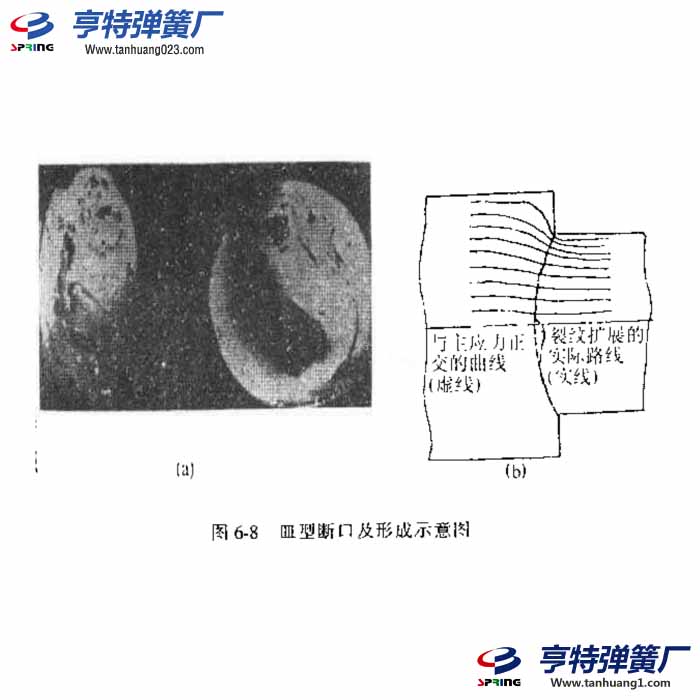 若应力沿轴向分布较均匀,则弹簧弯曲疲劳断口一般为一个与轴线相垂直的平断日,若因截面积的突然变化引起应力集中,则在应力集中截面处形成的弹簧弯曲疲劳断口不是平的,而是一个碟形的所谓皿型断日,图6-8示出了主应力线及裂纹扩展路线。如果在轴颈处有一定的应力集中,且同时承受一定的扭矩,则旋转弯曲疲劳可能同时产生几个疲劳核心。由于扭矩的作用,裂纹将以螺旋状向前扩展,最后这些裂纹在轴的中央会合,形成棘轮状断口。