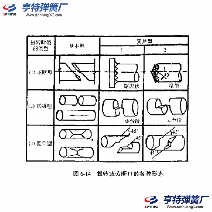 有时也会出现混合型断口,如先以切断型扩展,以后又转变为正断型扩展。常见的扭转疲尝断日型式可归纳为6-14所示的几种形态。